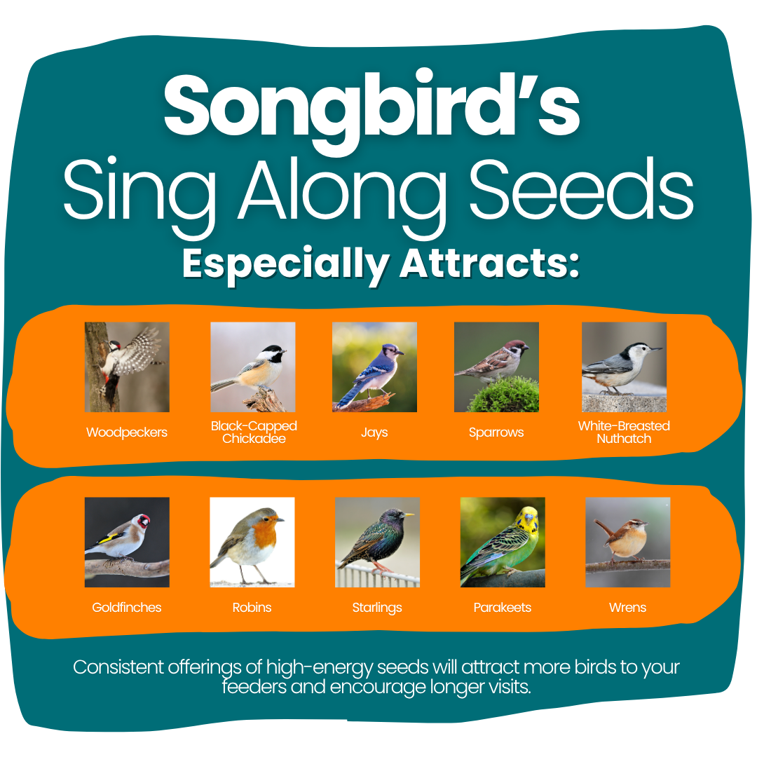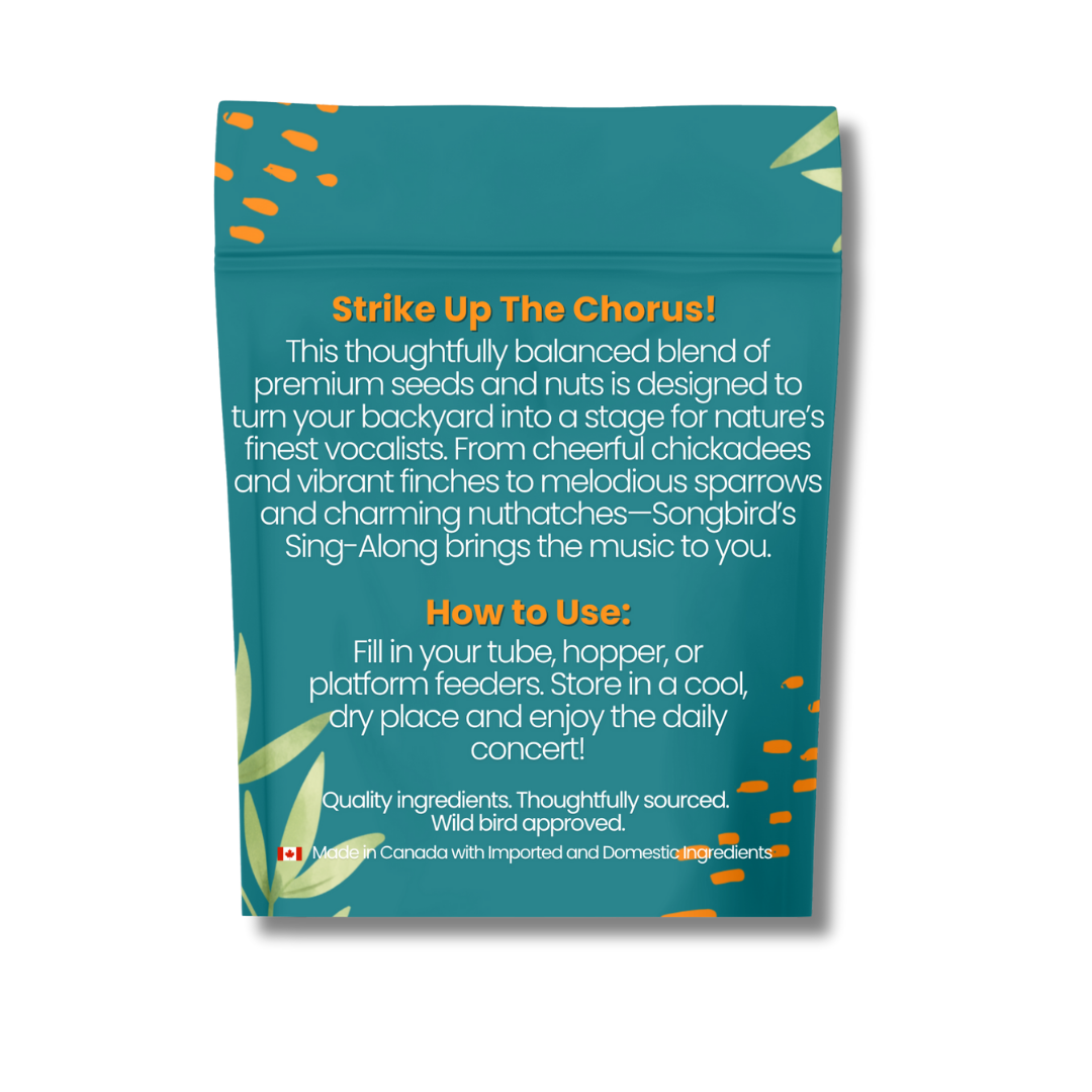 Bring the joy of songbirds to your backyard with our specially crafted premium bird seed blend. Designed to attract chickadees, goldfinches, sparrows, and other melodious favorites, this mix keeps your feathered visitors coming back day after day. Featuring a carefully selected variety of seeds—including Black Oil Sunflower, White & Red Millet, Sunflower Kernel Chips, Nyjer, Safflower, and Peanuts—this blend appeals to a wide range of songbirds while providing essential nutrition. Packed with natural oils and proteins, it supports health, feather shine, and overall vitality. Versatile enough for tube, hopper, or platform feeders, it’s the perfect addition to any backyard setup. Proudly made in Toronto, Canada, this wholesome mix offers birds a premium meal that will have them singing for more.
