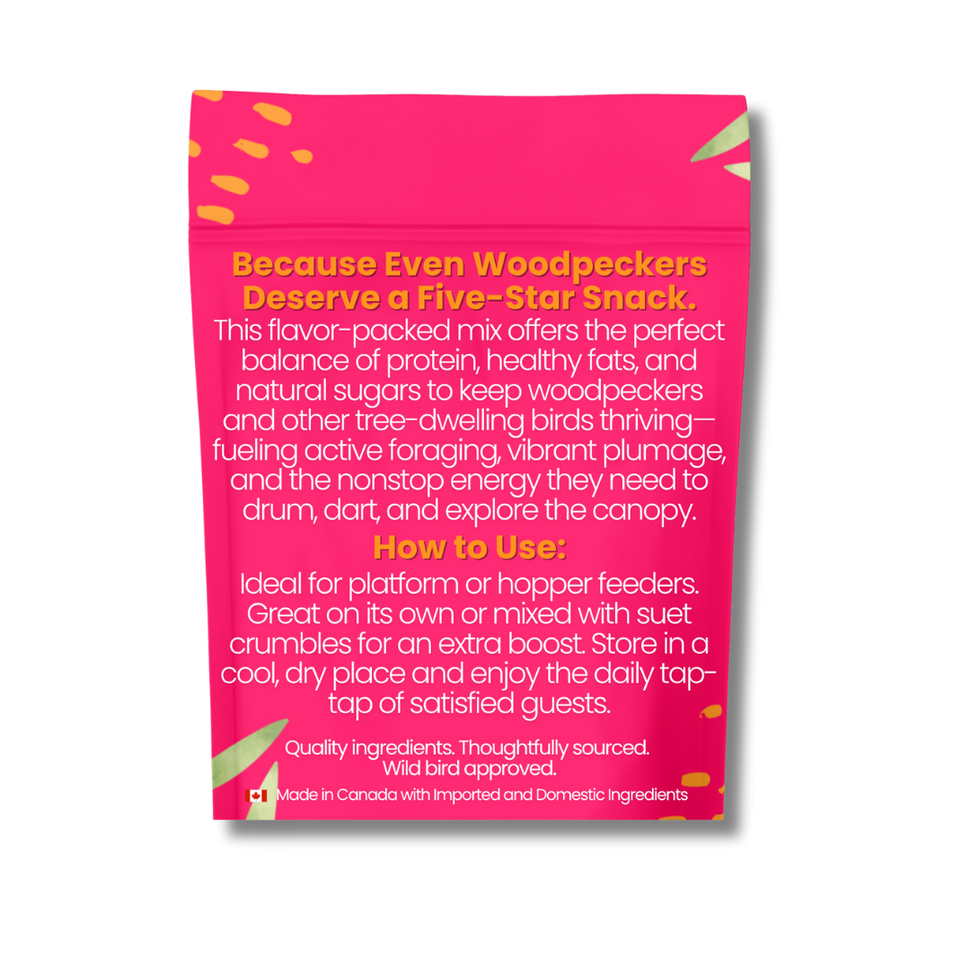 Designed specifically for woodpeckers, flickers, and other active forest birds, this high-energy blend fuels their daily foraging and supports their strength and stamina. Packed with protein and healthy fats from sunflower kernel chips, black oil sunflower seeds, peanuts, and walnuts, it provides the essential nutrition these birds need. A naturally sweet fruity boost of raisins, dried cranberries, and real dried pineapple adds antioxidants and irresistible flavor. Made with only premium seeds and fruits—no fillers or unwanted grains—every bite promotes bird health, activity, and song. Proudly crafted and packed in Toronto, Canada, this mix helps support wild bird populations across the country.