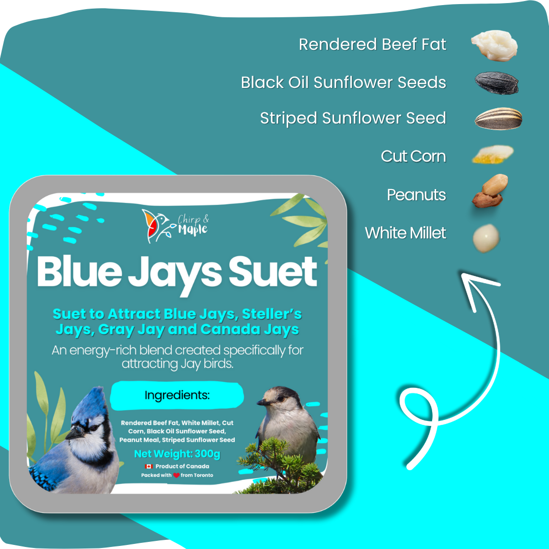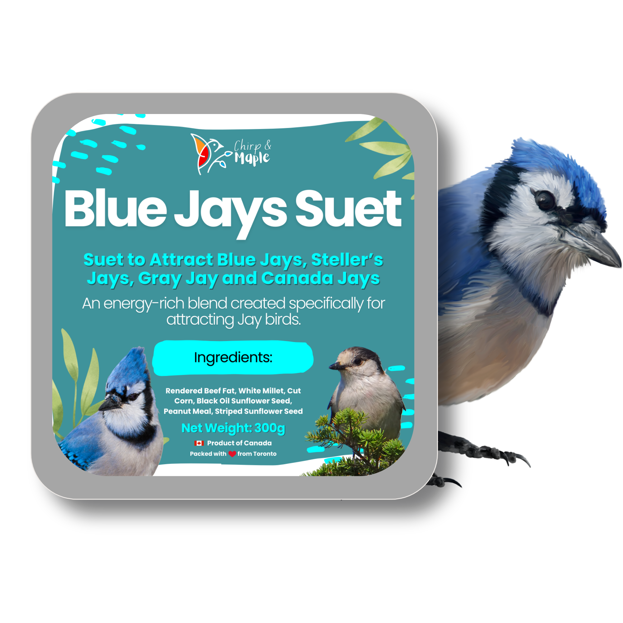 Give jays the feast they crave with our premium suet, specially crafted to attract Blue Jays, Steller’s Jays, Gray Jays, and Canada Jays. Packed with whole corn, striped sunflower, black oil sunflower seeds, and peanuts, this blend delivers the hearty, energy-rich ingredients bold and active birds love. High in calories and healthy fats, it fuels jays through harsh winters, busy breeding seasons, and year-round feeding. Best offered in platform or large hopper feeders, the open design makes every bite easy for larger birds to enjoy. With 100% quality ingredients and absolutely no fillers like milo or wheat, you can be confident that what’s in the bag is exactly what your backyard jays want. Thoughtfully made and packed in Toronto, this suet provides a wholesome, premium meal that keeps your feathered friends coming back for more.