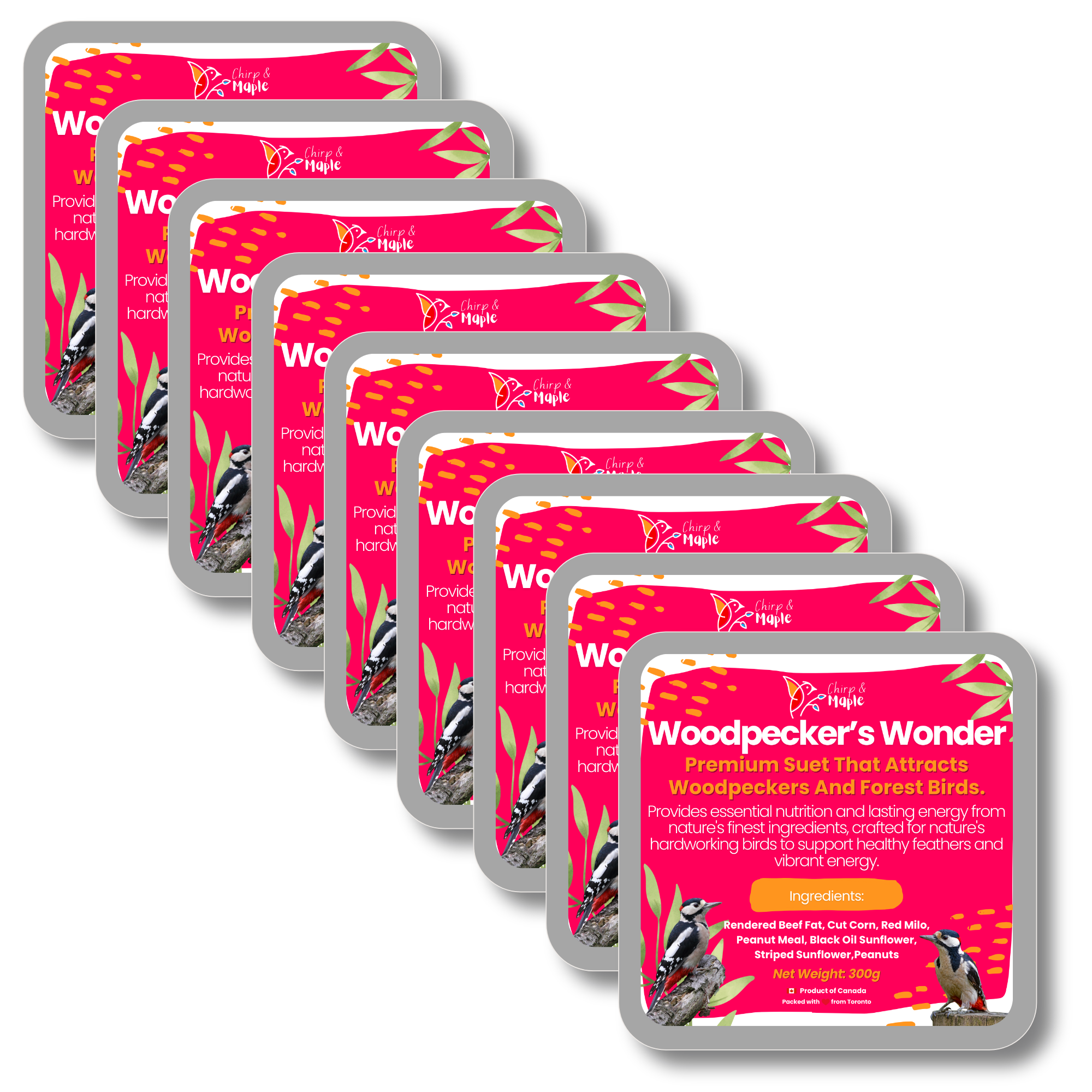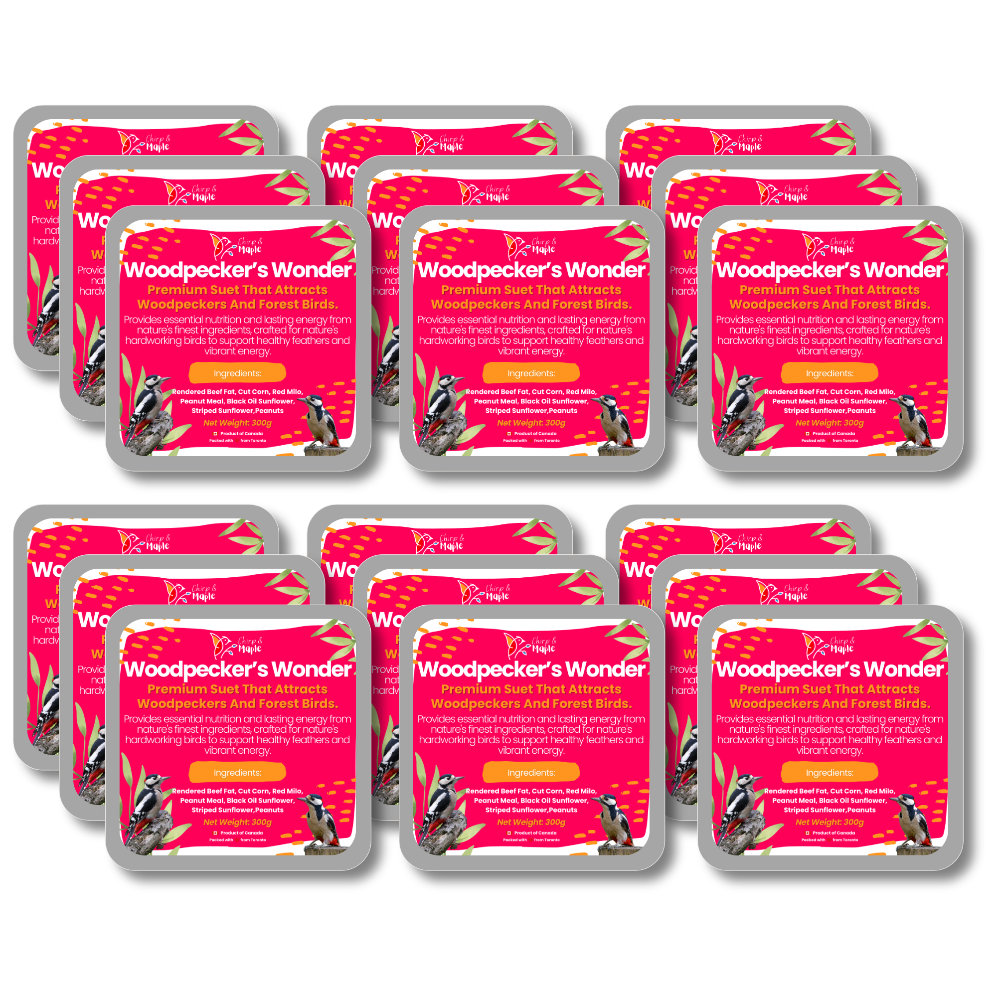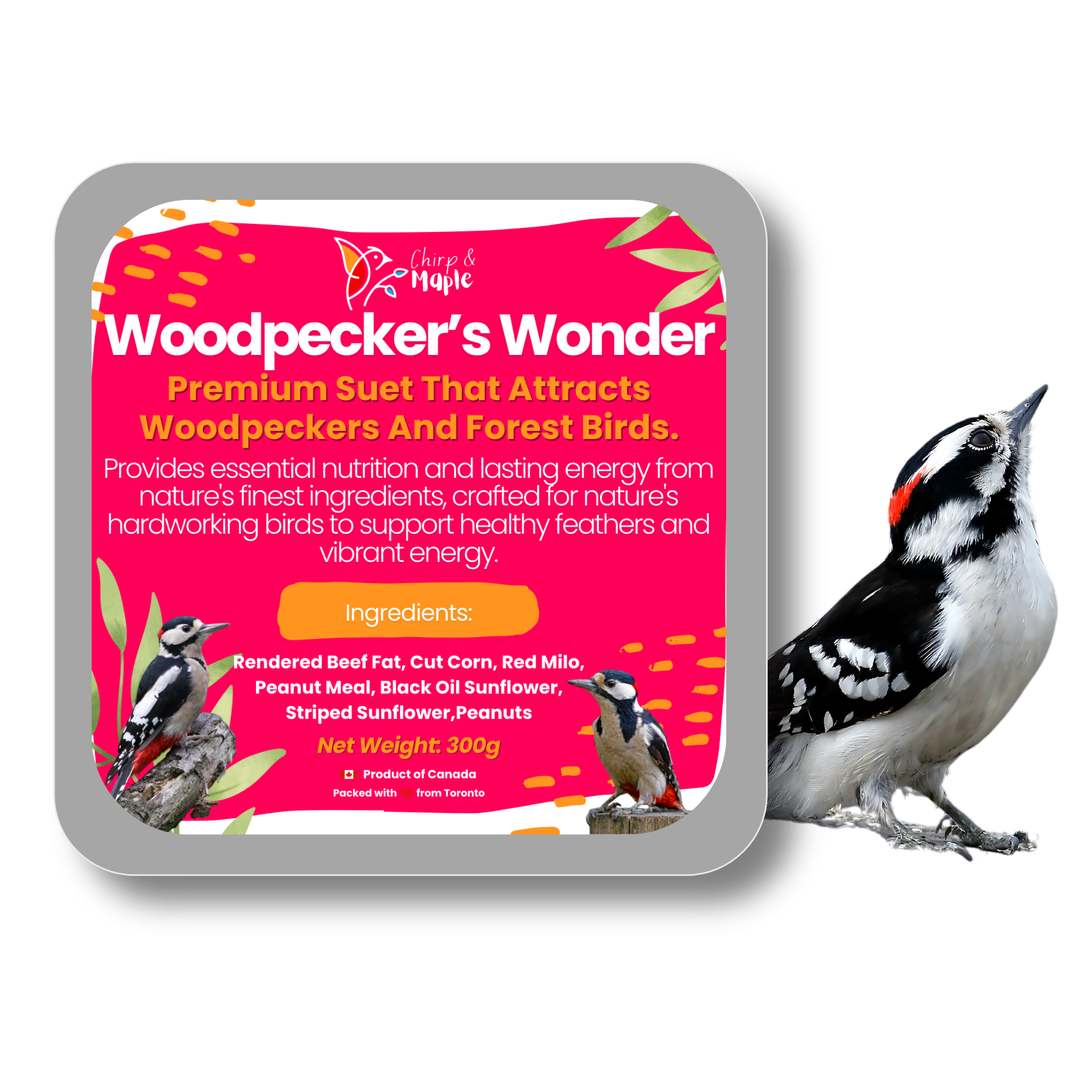 Specially crafted for woodpeckers, flickers, and other active forest birds, this premium suet delivers the high-energy fuel they need to thrive. Packed with protein-rich sunflower kernel chips, black oil sunflower seeds, peanuts, and walnuts, it provides essential fats to power strength, stamina, and daily foraging. A naturally sweet boost of raisins, dried cranberries, and real dried pineapple adds antioxidants and irresistible flavor, while the clean, filler-free recipe ensures every bite supports bird health and vitality. Thoughtfully made and packed in Toronto, Canada, this suet offers only the finest ingredients to keep wild birds strong, active, and singing year-round.