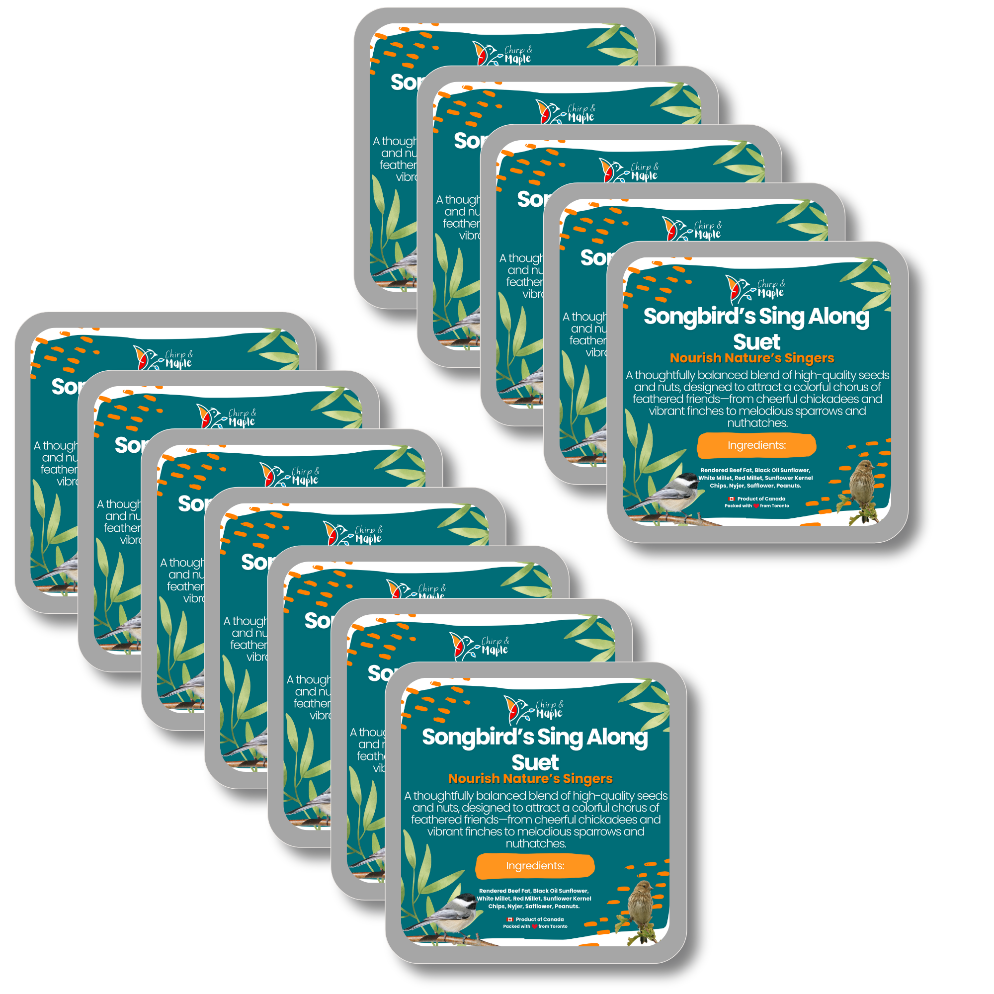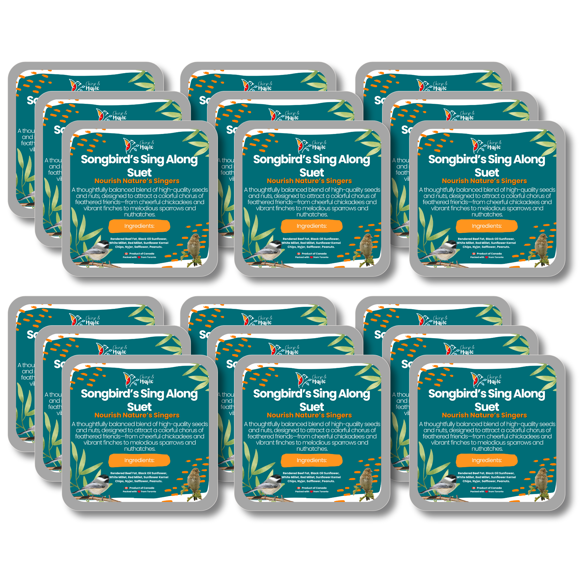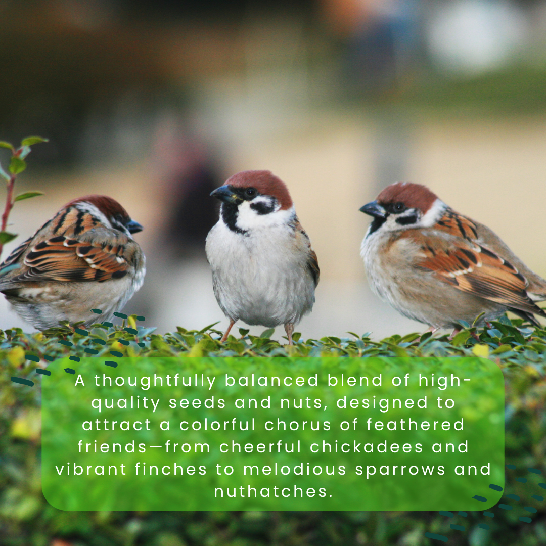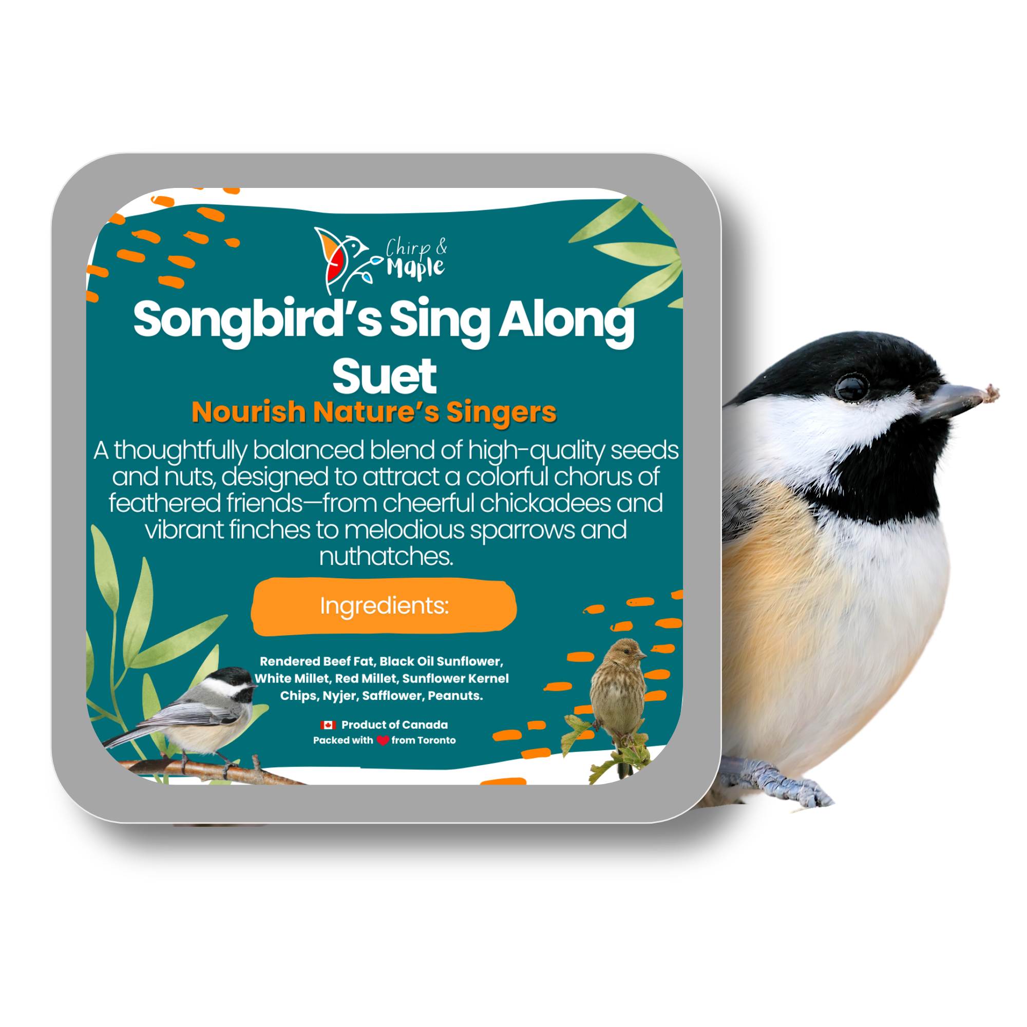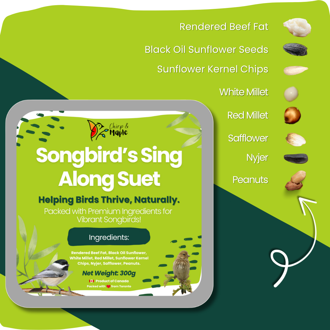 Bring the sweet songs of nature right to your backyard with our Premium Suet Blend, specially crafted to attract chickadees, goldfinches, sparrows, and other melodious favorites. Packed with a rich variety of Black Oil Sunflower, White & Red Millet, Sunflower Kernel Chips, Nyjer, Safflower, and Peanuts, this suet delivers a perfect balance of taste and nutrition that keeps birds returning day after day. Naturally rich in oils and proteins, it supports strong, active birds with healthy, vibrant feathers. Versatile and easy to use, it’s ideal for tube, hopper, or platform feeders, making it the perfect addition to any backyard setup. Thoughtfully blended and packed in Toronto, Canada, this wholesome suet is designed to give your feathered visitors the premium meal they deserve—and the songs you’ll love to hear again and again.