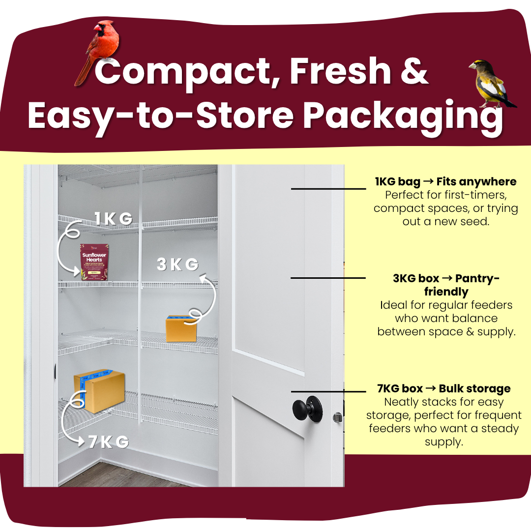Treat your backyard birds to a premium snack with our 100% whole sunflower hearts. Free from shells and fillers, these nutrient-rich, high-energy seeds are a favorite among a wide variety of wild birds. Enjoy cleaner feeders and less mess in your yard while attracting more feathered visitors for longer, more enjoyable visits. Packed in a convenient 1KG bag, it’s perfect for year-round feeding and keeping your garden lively with activity.